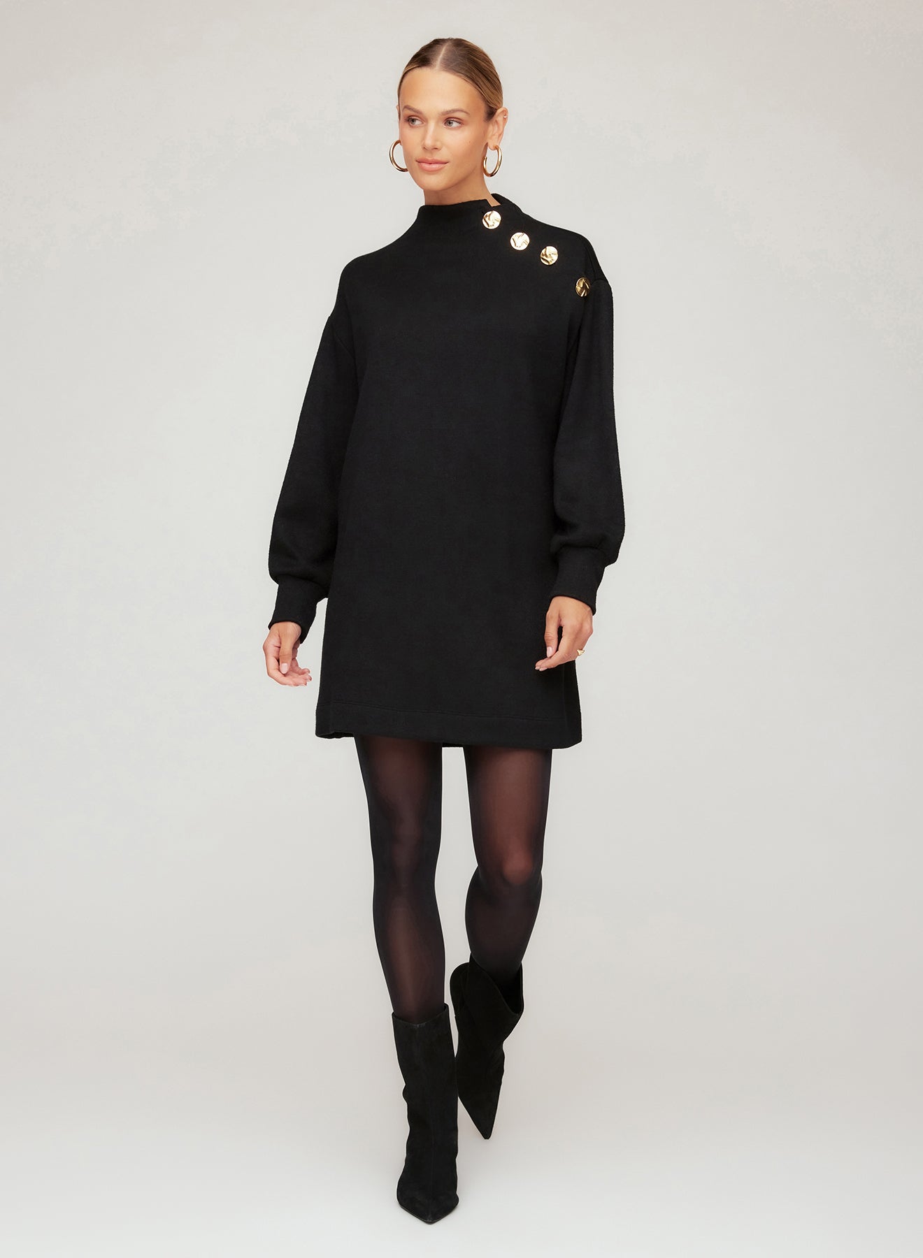 Made from ultra-soft double brushed knit, this pull-on mini silhouette features a mock neckline and an asymmetric shoulder placket with tonal buttons. Subtle drop shoulders lead into long voluminous sleeves with slightly extended cuffs, while a wide-edge hem lends a modern, balanced finish—easy to dress up or down.
