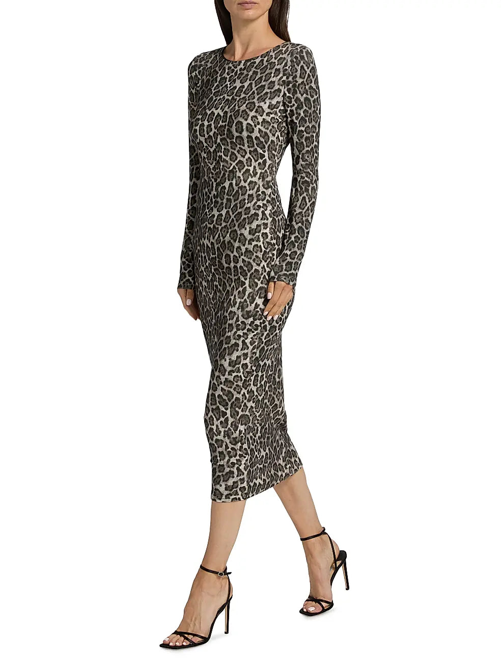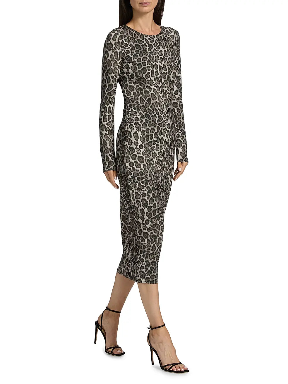 Crafted of a stretch jersey fabric, fitted midi-dress features a striking leopard print, classic round neck, and sophisticated long sleeves.