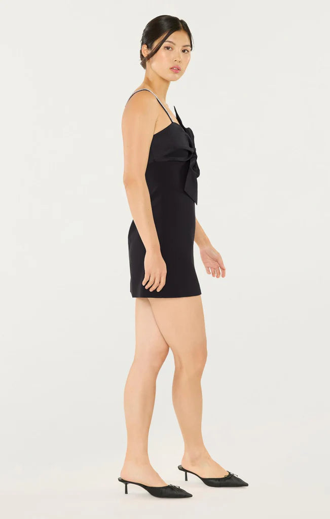 Designed for elegant versatility, the Liora Dress is a classic black mini distinguished by a satin oversized bow at the front, adding a striking yet elegant detail. A timeless silhouette with contemporary details, this dress suits any occasion effortlessly.
