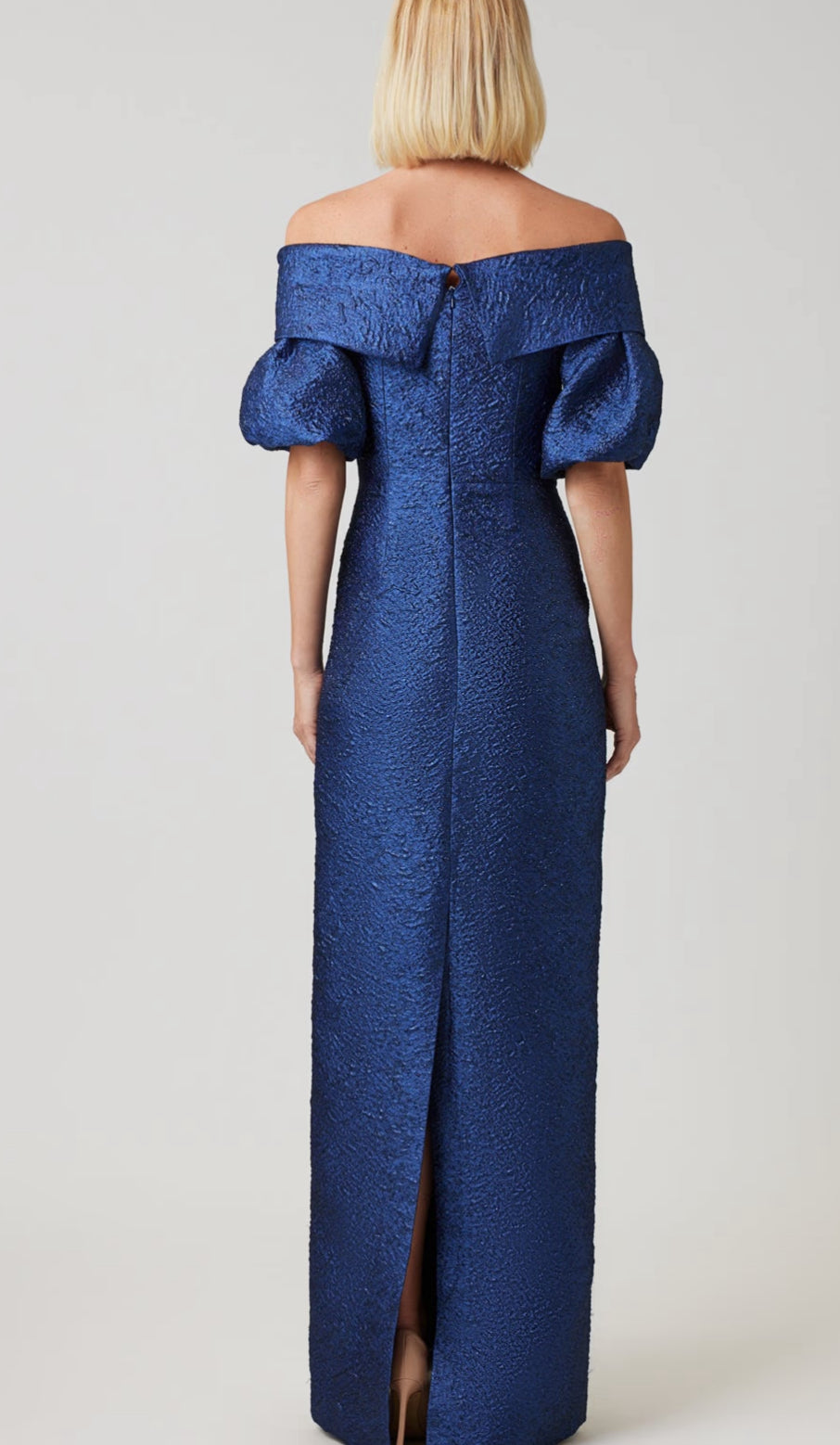 Turn heads in this jacquard gown, featuring a stunning off the shoulder design that highlights your neckline, while the puff sleeves add a touch of drama and romance. Crafted from luxurious metallic jacquard fabric, this dress shimmers with every movement, ensuring you shine at any event. The structured bodice flows into a flattering silhouette, creating an elegant and graceful look perfect for formal occasions, weddings, or evening soirées. Elevate your style with this captivating gown that blends sophistication and modern flair, making you the center of attention wherever you go.