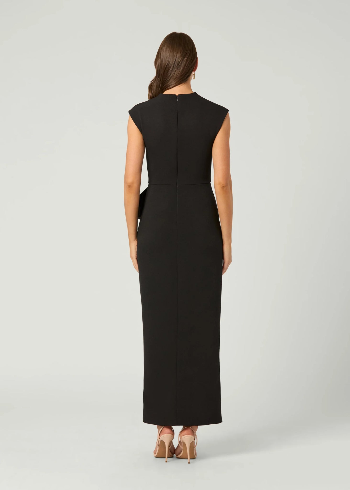 Modern and chic black stretch crepe gown. Style features an asymmetric neckline and a sleeveless bodice. Beautiful bow detail on the neck and waist. Form fitted silhouette with a column skirt, and the skirt has a side slit. Bodice lined, skirt unlined. Hidden back zipper.