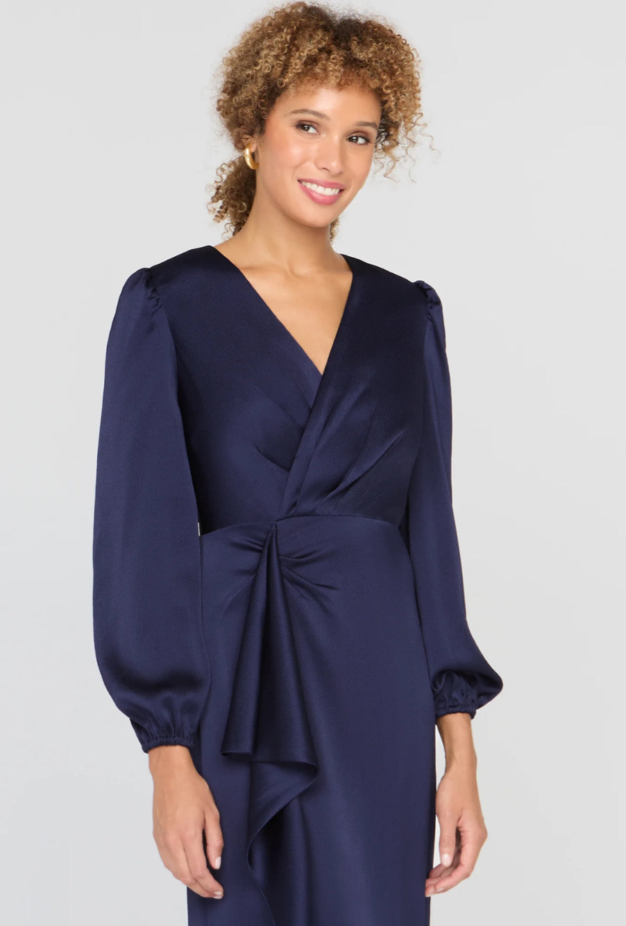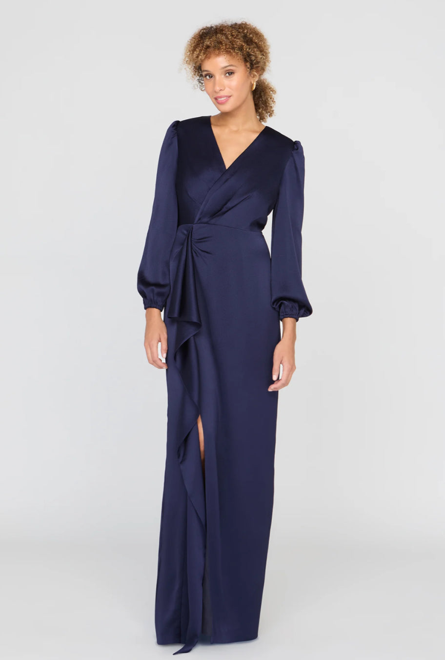 Hammered charmeuse gown with a faux wrap bodice and gently draped bishop sleeves. Finished with a cascading ruffle along the column skirt and a side slit for soft movement. A romantic pick for winter weddings, holiday dinners, or candlelit soirées.