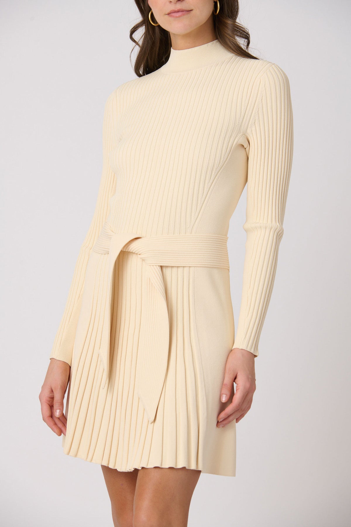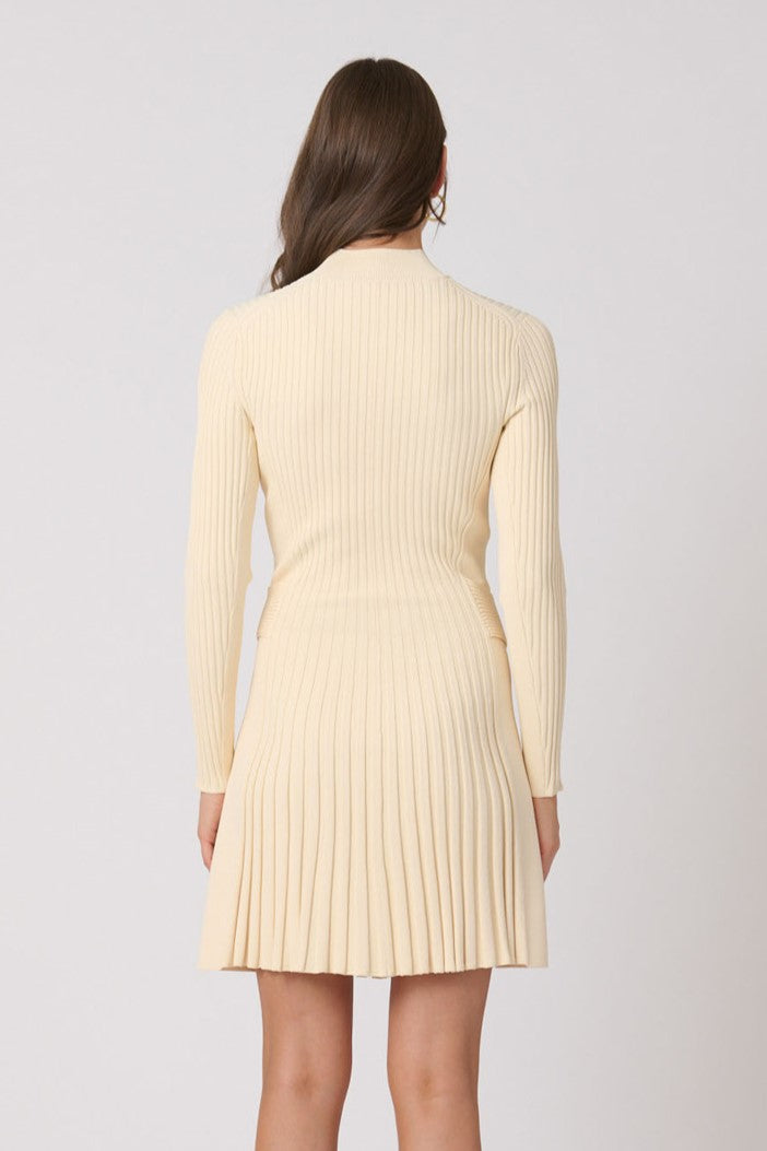 Sophisticated yet playful, this mini dress features a sleek high neckline, long sleeves, and an asymmetrical pleated skirt that adds modern movement. The tailored waist detail creates a flattering silhouette, making it perfect for day-to-night dressing. Effortlessly chic for parties, dinners, or special occasions.