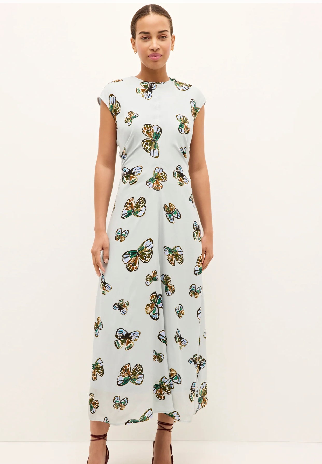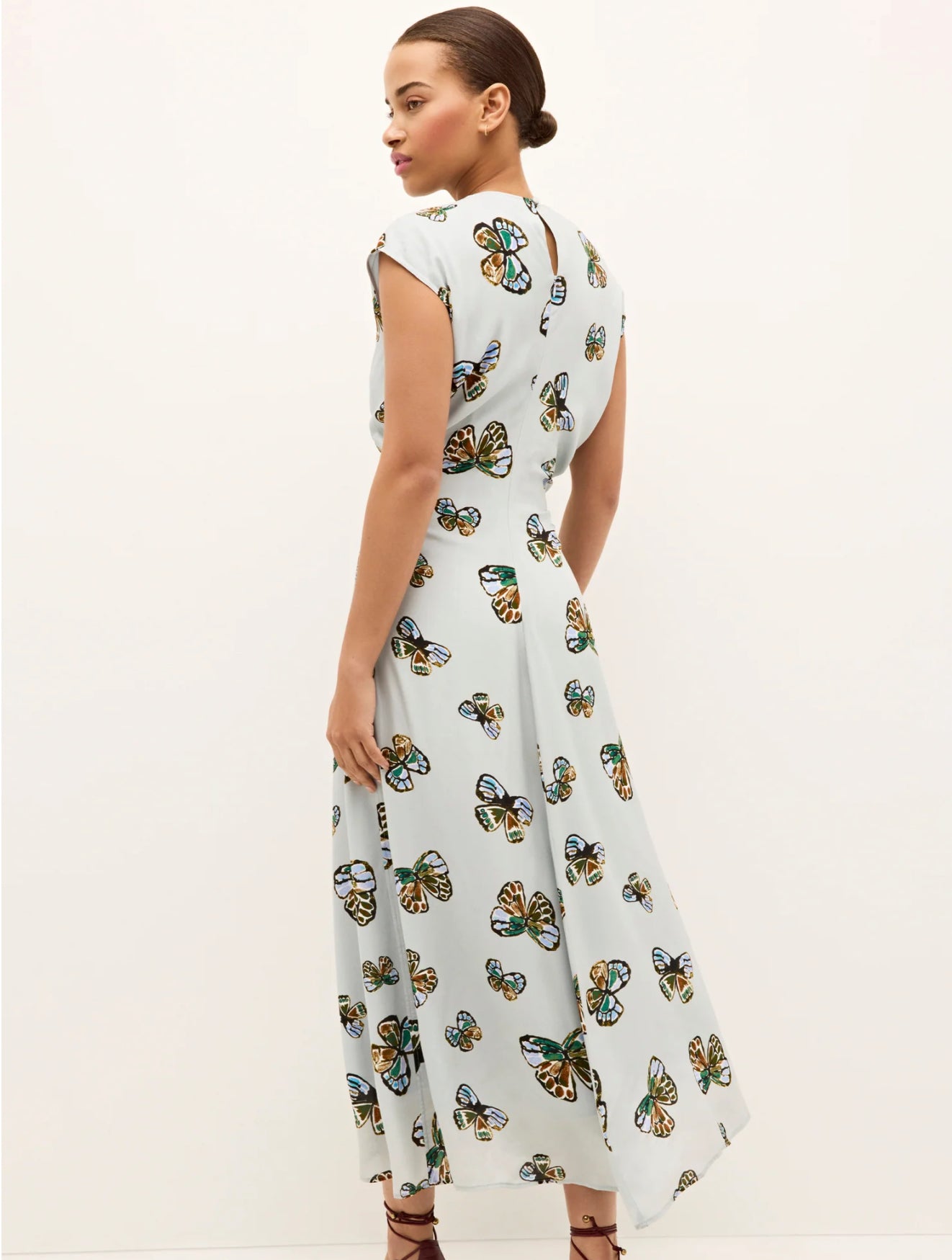 Cut on the bias with pleated waist detailing and a center-back keyhole opening, this sophisticated maxi dress is designed to bridge summer-to-fall gap. Our lighthearted Adonis print adds a dose of playfulness with its kaleidoscope of butterflies set against a sky-blue background