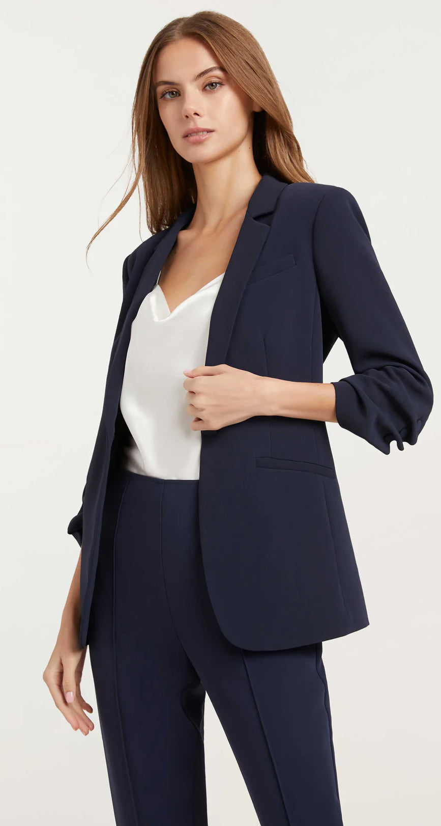 Look polished and professional in this Crepe Khloe Blazer. This expertly tailored piece features a collared neckline, notched lapels, and stylized sleeves for a look that is modernly classic. The classic navy color will have you standing out with sophisticated style. Make a powerful statement with this must-have blazer.