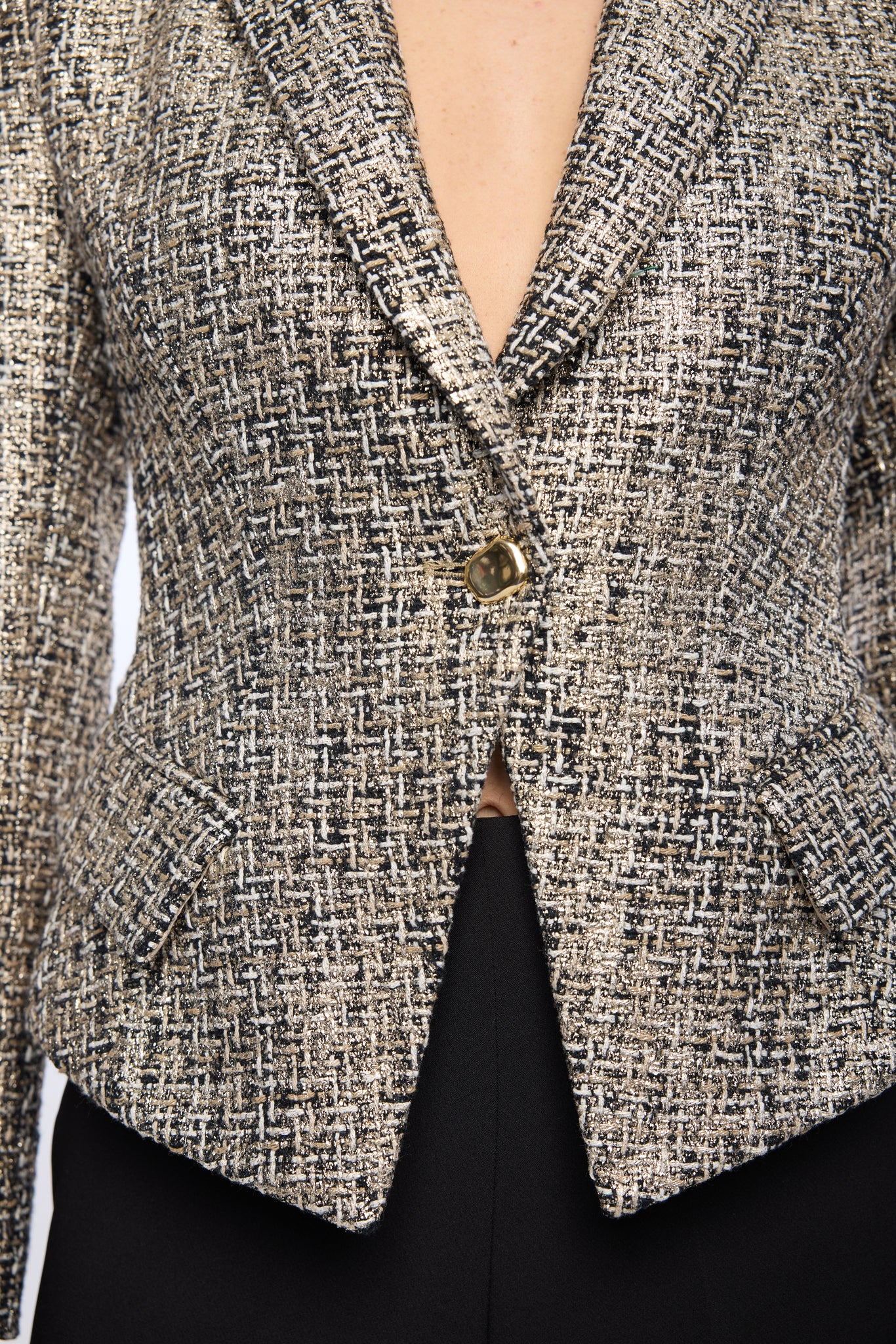 Polish your wardrobe with the Mara Tweed Blazer. Tailored in a luxe gold multi tweed, this single-breasted silhouette features subtle structure and a refined finish. Perfect for elevating office looks, layering over dresses, or pairing with the matching Riley Skirt for a coordinated set. A timeless piece that transitions seamlessly from work to evening.