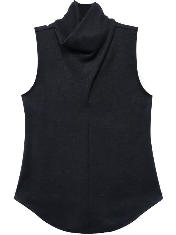 Crafted from soft double brushed knit, this modern sleeveless silhouette features a tall turtleneck accented by subtle layered detailing for added dimension. Perfect for styling solo or under blazers and jackets, it delivers clean lines and a refined edge in one polished package.