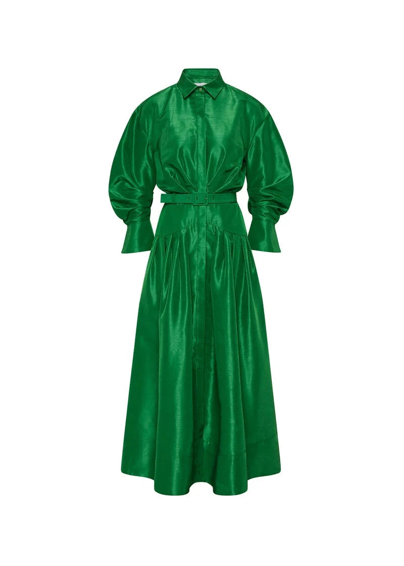 The Maple Shirt Midi Dress in green exudes modern sophistication, tailored from slub taffeta. The sleek stand collar and cocoon sleeves seamlessly complement the shirt dress silhouette, enhanced by a drop waist yoke and self-belt to elevate the design. Side seam pockets and a concealed placket complete the polished look, while an additional slip dress allows for versatile styling. Perfect for both day and night occasions, this dress is a must-have wardrobe essential.