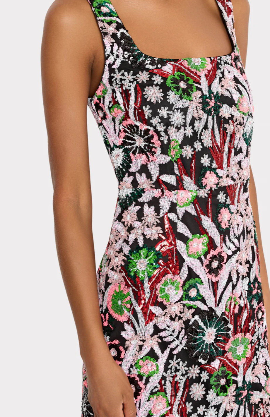 For cocktail parties, dance floors, and beyond, this party-ready mini silhouette is done with a mesh floral and sequin overlay. It has a low neckline, thick, comfortable straps, and is finished with a back zipper to close.