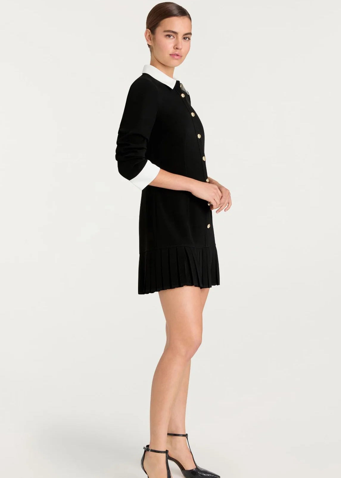 The Drapey Crepe Lucilla Dress combines timeless appeal with modern ease. This button-up mini features a striking contrast collar and cuffs, scrunched three-quarter sleeves, and a pleated skirt that moves beautifully. A timeless staple that seamlessly transitions from casual to chic, delivering effortless style for every occasion.