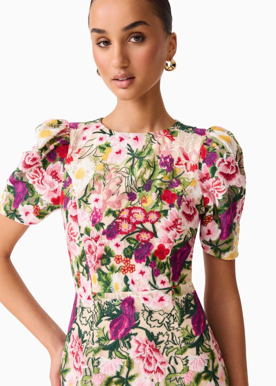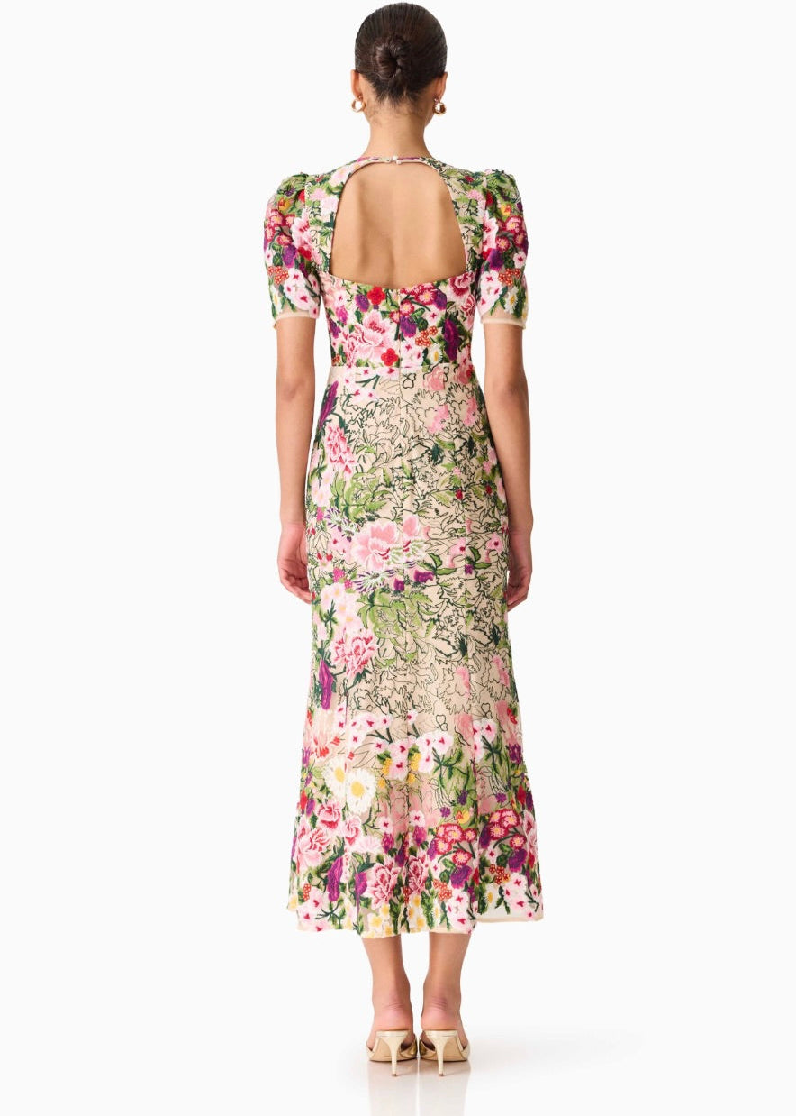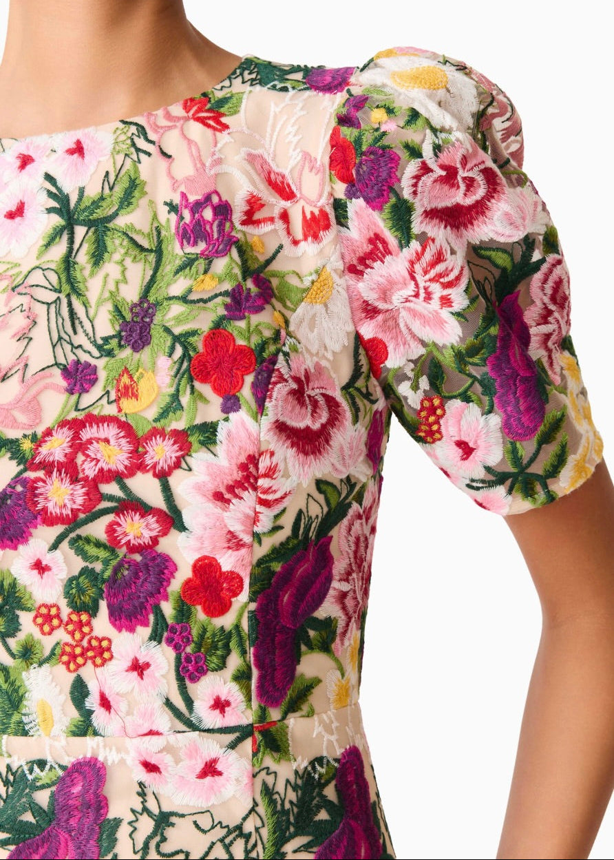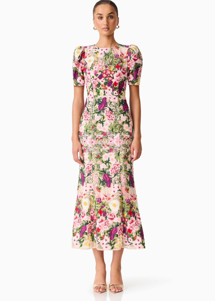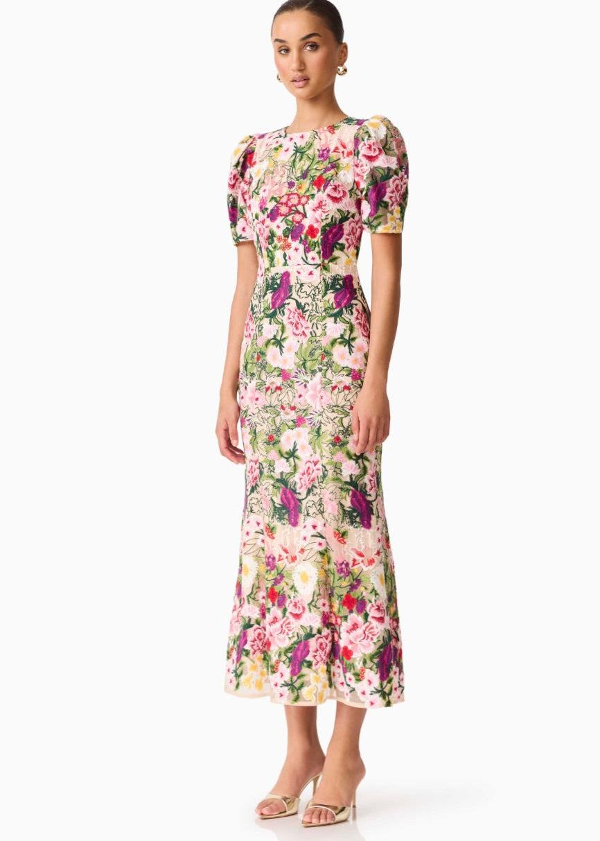This stunning midi dress is a celebration of vibrant color and intricate design. Featuring an allover floral pattern in rich shades of pink, purple, and green, it offers a beautifully artistic and feminine look. The fitted bodice and defined waist create a flattering silhouette, while the puffed short sleeves add a touch of vintage-inspired charm. Flowing into a graceful midi-length skirt, this dress is perfect for weddings, special events, or elegant daytime occasions. A timeless piece that blends sophistication with bold botanical beauty.