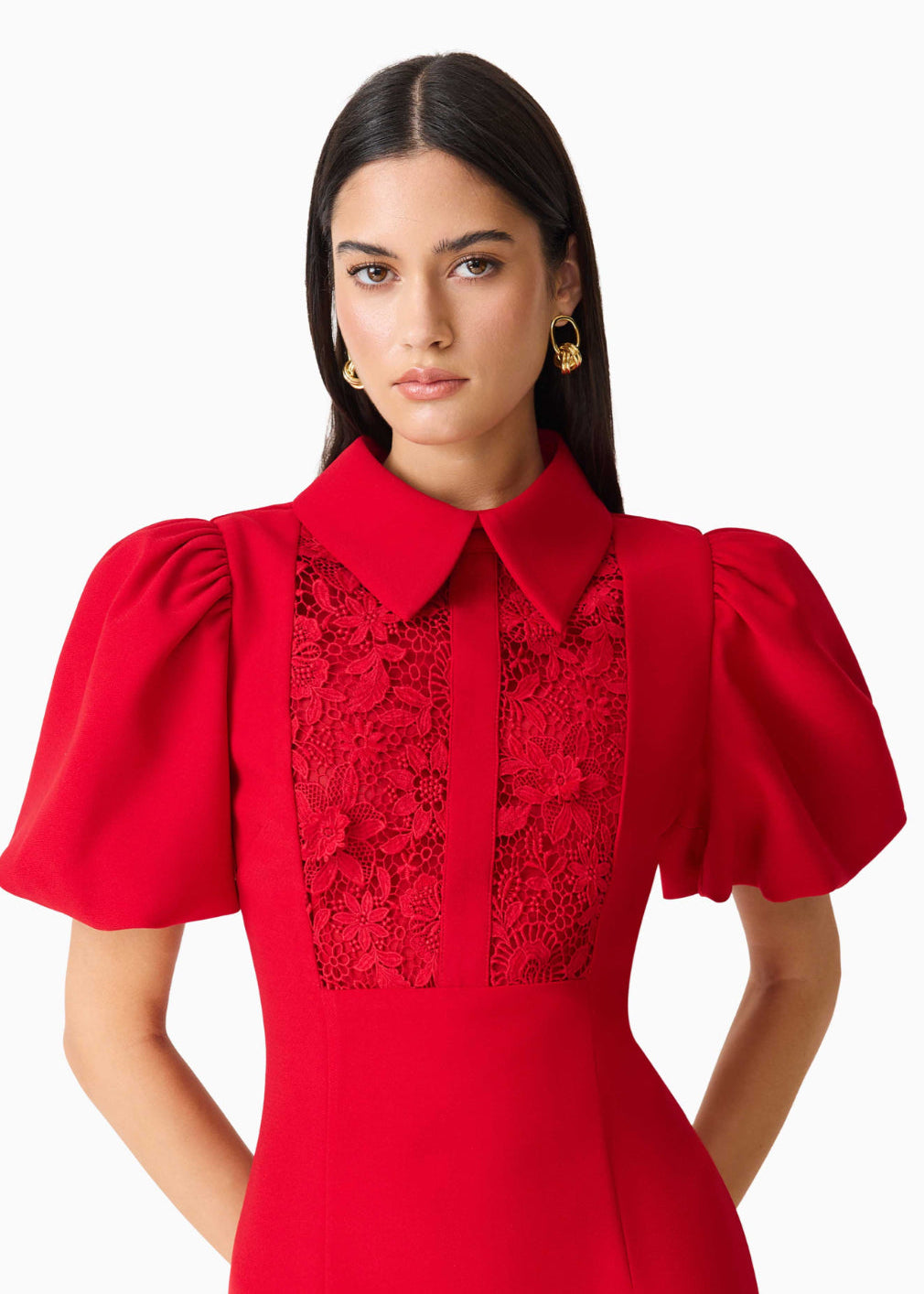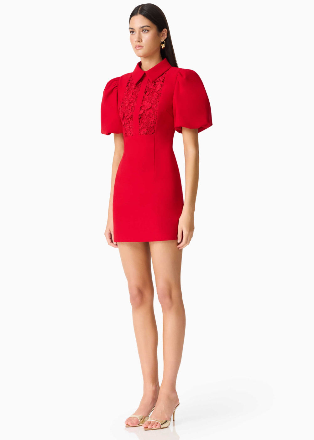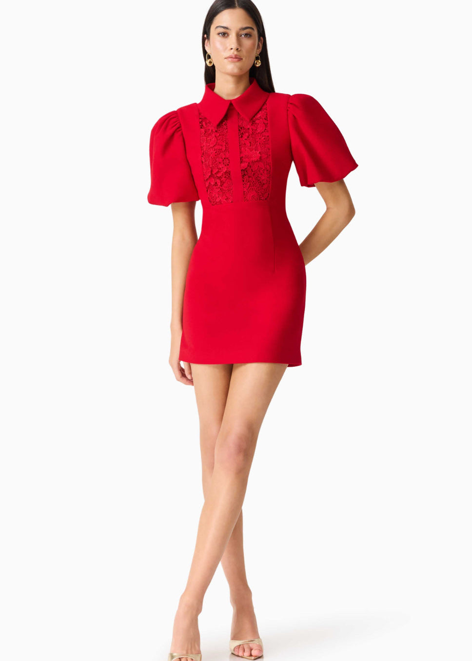 This vibrant red mini dress blends classic elegance with modern flair. It features a structured collared neckline and a beautifully detailed lace panel across the bodice, adding texture and sophistication. The puffed short sleeves create a bold, feminine silhouette, while the fitted waist and sleek skirt offer a flattering, tailored look. Designed with clean lines and eye-catching details, this dress is perfect for making a stylish statement at parties, dinners, or special occasions.