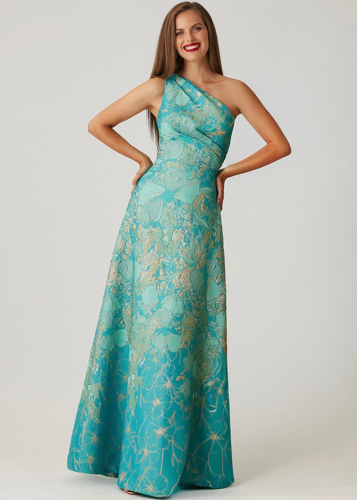 Turn heads in this striking one shoulder gown, crafted in a luxurious metallic floral jacquard that shimmers in turquoise and gold tones. The ruched bodice creates a flattering, sculpted fit, while the full A line skirt flows elegantly to the floor for a timeless silhouette. Sophisticated yet statement making, this gown embodies modern glamour and is perfect for formal weddings, galas, and special evening occasions.