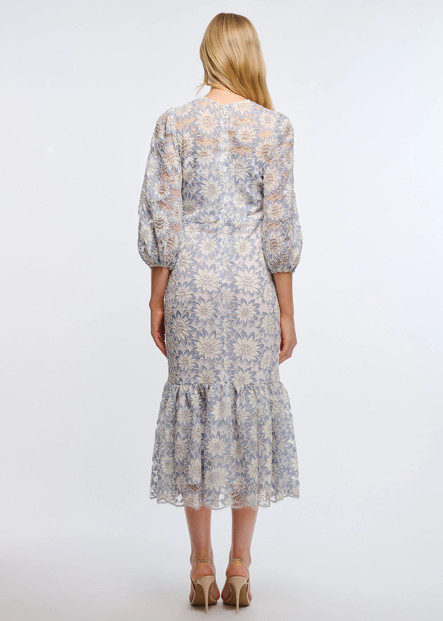 Midnight Adaya is an elegant, corded lace cocktail dress. Style features a round neckline with 3/4 length balloon sleeves with elastic opening. The bodice top yoke is unlined, with a see-through effect on the shoulder. Form fitted silhouette body and full volume skirt with a bottom ruffle with a scallop-edged hem. Fully lined except top yoke and sleeves. Hidden back zipper.