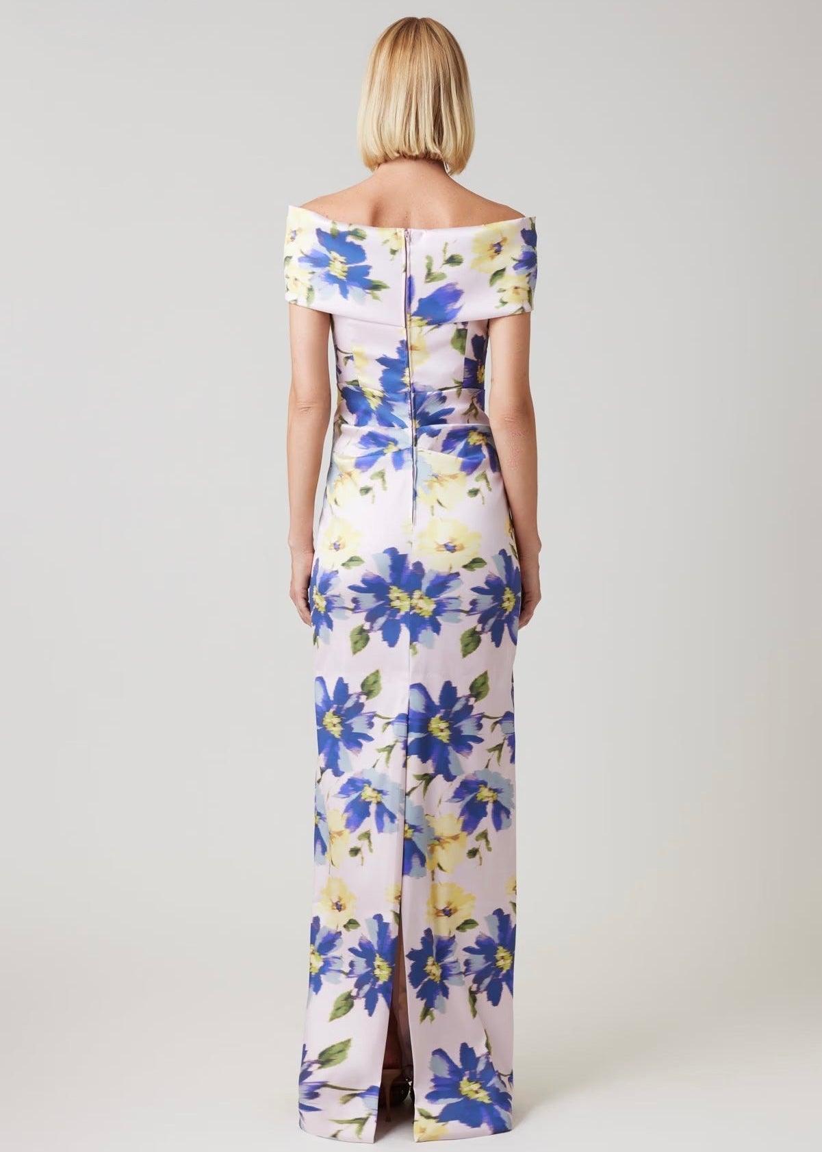 Stand out in this exquisite mikado gown featuring a dreamy watercolor floral print. The romantic off the shoulder design with cuff detail creates an alluring neckline that beautifully frames the shoulders, while the expertly ruched bodice ensures a flattering fit that enhances your natural silhouette. Crafted from luxurious mikado fabric, the sleek column silhouette hugs your curves before flowing gracefully to the floor. Perfect for spring weddings, formal garden parties, and elegant evening celebrations.