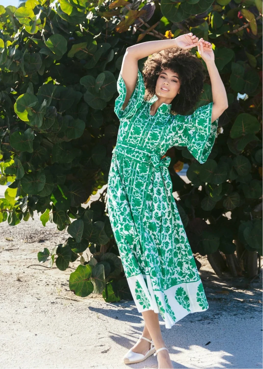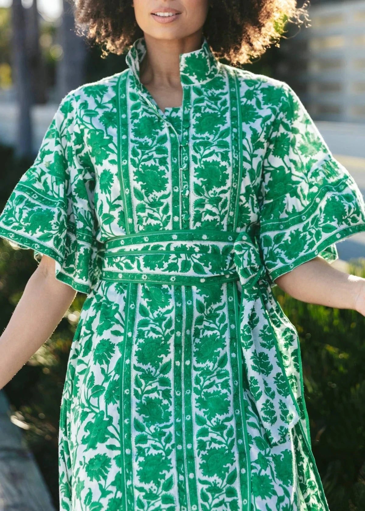 The Palladio Kaftan is a the hostess kaftan of dreams. Palladio was inspired by the rich, textural combinations at the Bar Palladio in Jaipur, India. The airy flutter sleeve paired with a dramatic a-line skirt is the perfect addition to your closet. It has a button front with our signature hand-piped placket detail. It has pockets and a reversible two-sided sash.