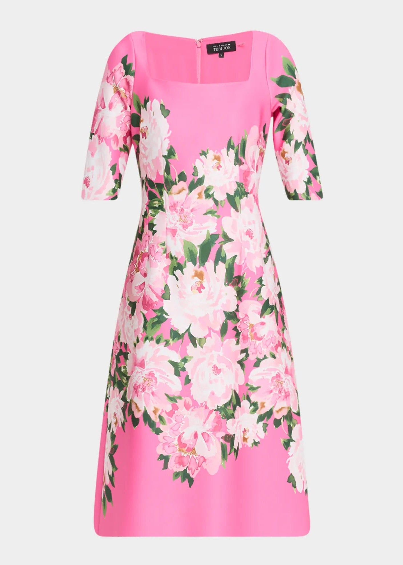 Embrace elegance in this Scuba Square Neck 3D Flower Shoulder Dress, designed with a timeless A line silhouette and knee-length hem for a flattering fit. The vibrant pink base is beautifully adorned with a blush pink floral pattern and soft greenery, creating a romantic and feminine look. A square neckline and short sleeves add classic charm, while the 3D flower shoulder appliqué brings a unique touch of texture and sophistication. Crafted from scuba fabric, this dress offers both structure and comfort, making it perfect for weddings, garden parties, and special occasions.