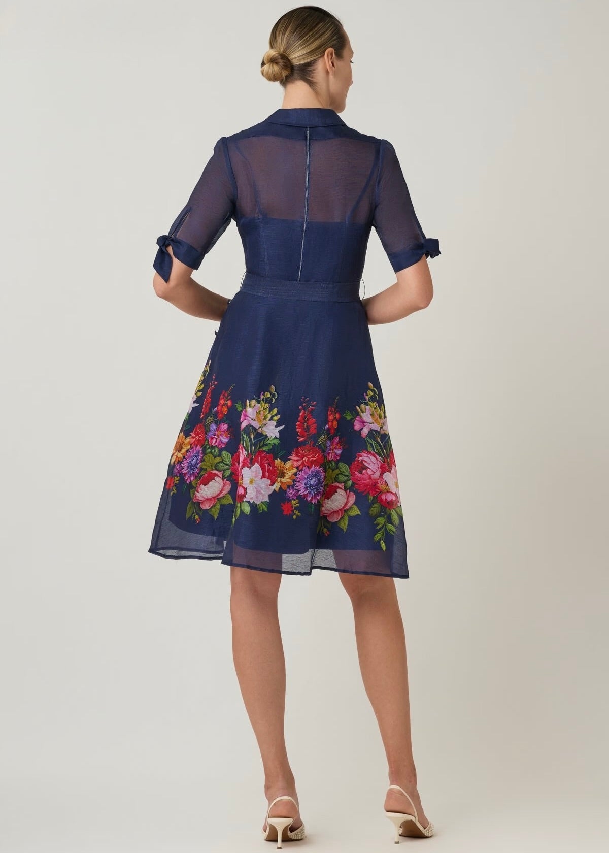 Designed with thoughtful detail, this silken linen shirtwaist dress features a vibrant floral border that brings color and dimension to the classic silhouette. The collared neckline and short sleeves offer tailored structure, while the removable sash cinches the waist for a flattering A line shape. Finished at a tea length with graceful movement, this dress is perfect for daytime celebrations, garden parties, and warm weather occasions where comfortable dressing is key.