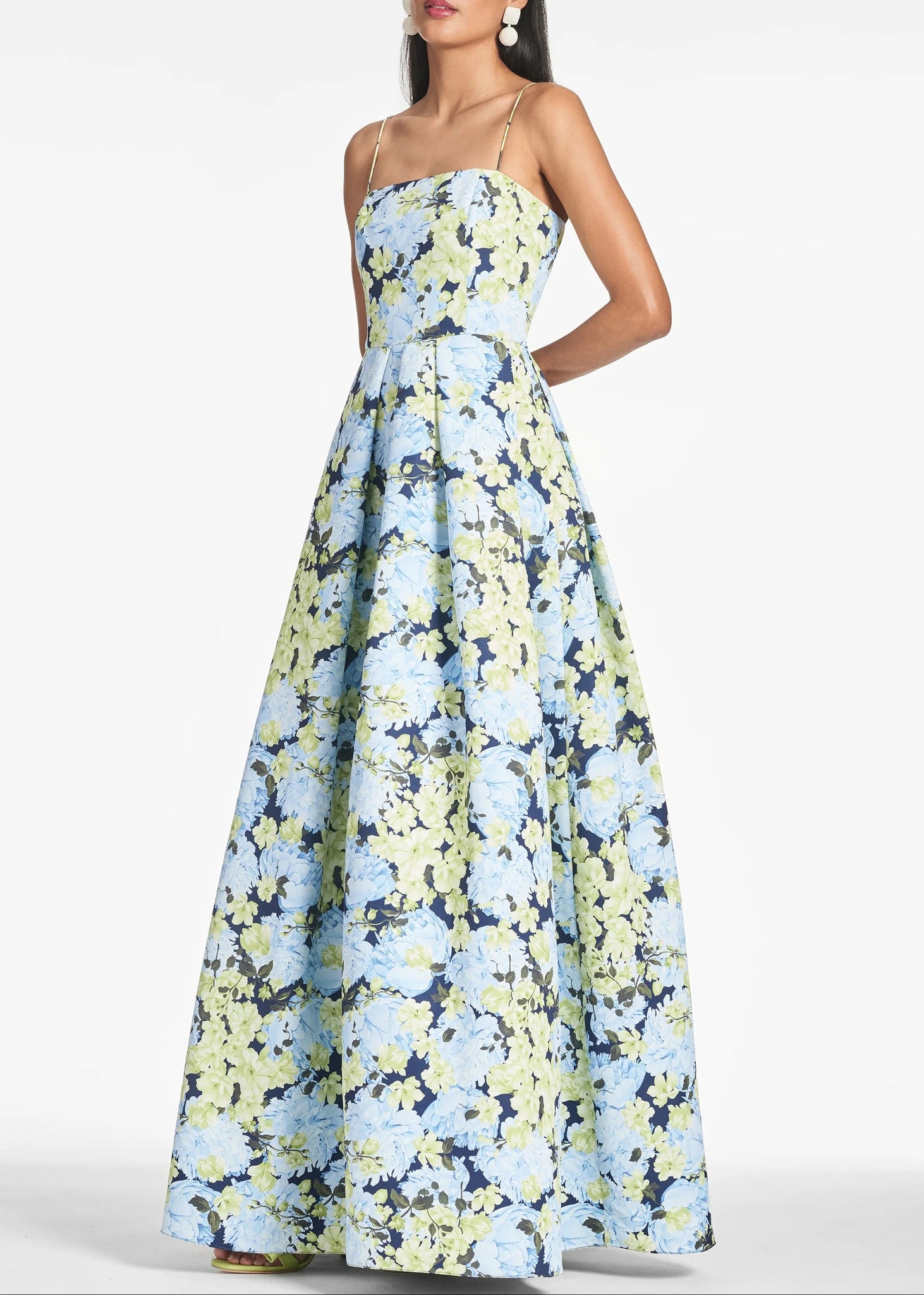 Introducing the Beau Gown in the custom garden club print. She is the perfect dress for any special occasion. The princess fit and flair silhouette is crafted in a chic faille with engineered pleats making it an elegantly whimsical and romantic choice. Featured in our Garden Club print, with peonies and gardenias in full bloom.