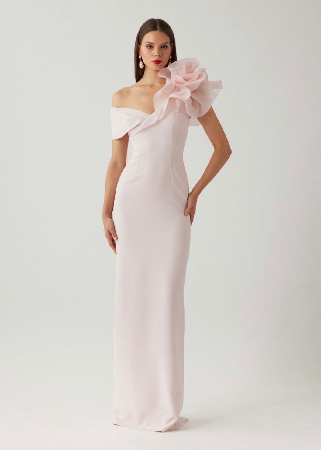 Crepe Asymmetrical Off Shoulder with Organza Ruffle Trim Column Gown