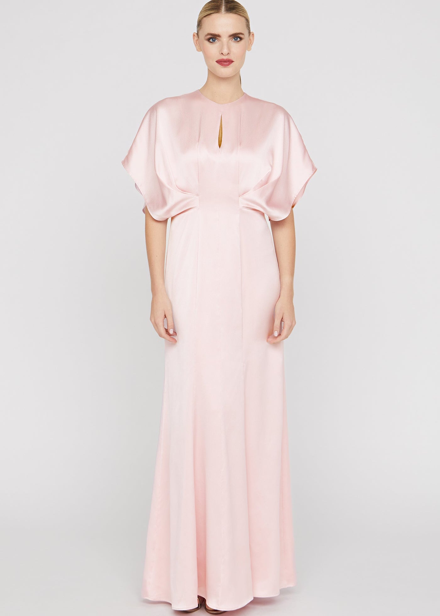 Hammered satin, draped dolman elbow sleeve, jewel neckline with keyhole, slightly flared seam detail skirt, front slit, gown.