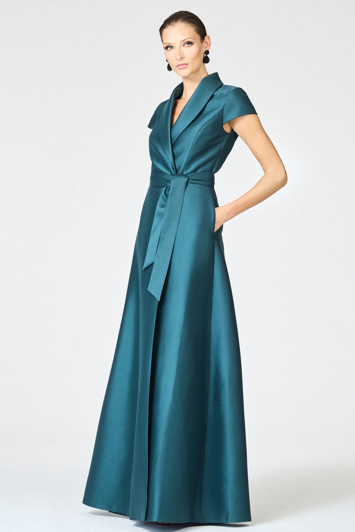 The Ettiene Gown in Forest Green is a striking, modern take on timeless tailoring. Crafted in lustrous mikado, it features a notched collar and wrap-front bodice that cinches at the waist with a matching tie belt. Short sleeves and a floor-length A-line skirt with subtle volume create an elegant, structured silhouette, while side pockets add an effortless, contemporary touch. Perfect for galas, formal events, or evening occasions where polished sophistication is key.
