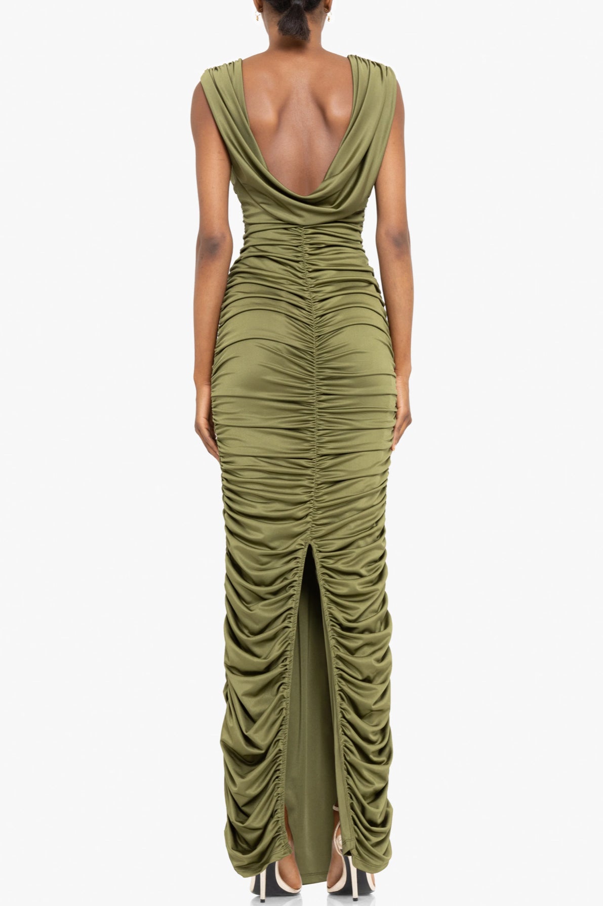 The Evangeline Gown features a soft cowl neckline and artfully shirred side seams that contour the body. The column shape adds length, while the open back introduces just the right amount of drama. Designed to move with you, this gown is made for warm nights and special occasions.