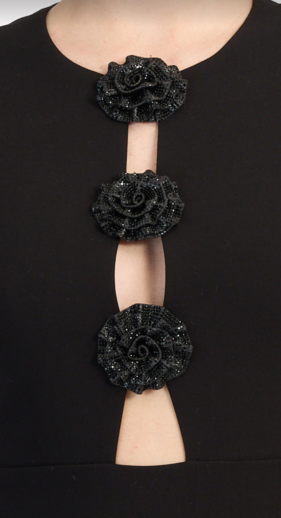 This striking black evening gown combines classic elegance with couture detail. The dress features a round neckline and dramatic puff sleeves that add a touch of vintage-inspired sophistication. The fitted bodice showcases a unique front cutout design, accentuated by three intricate black floral appliqués crafted from shimmering beaded fabric—adding depth, texture, and a subtle sparkle. The sleek, floor-length silhouette elongates the figure, creating a graceful and refined presence. Perfect for formal occasions or red-carpet events, this gown exudes modern glamour with timeless allure.