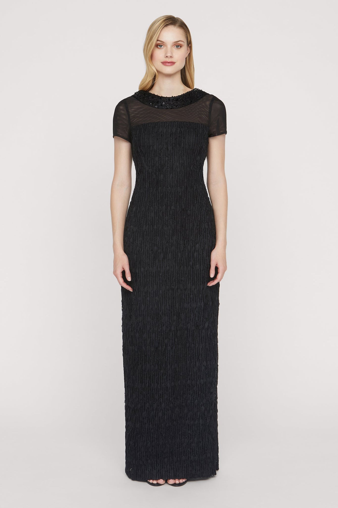 Vertical soutache embroidery creates a soft, light-absorbing texture on this stretch column. Finished with sheer mesh sleeves and an embellished neckline—made to move with you from ceremony to celebration.