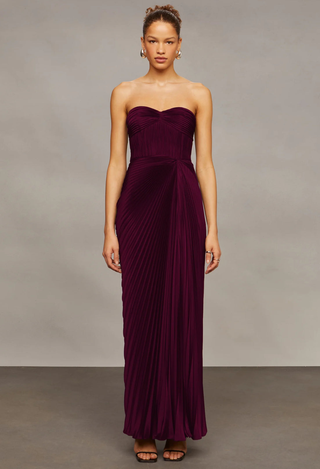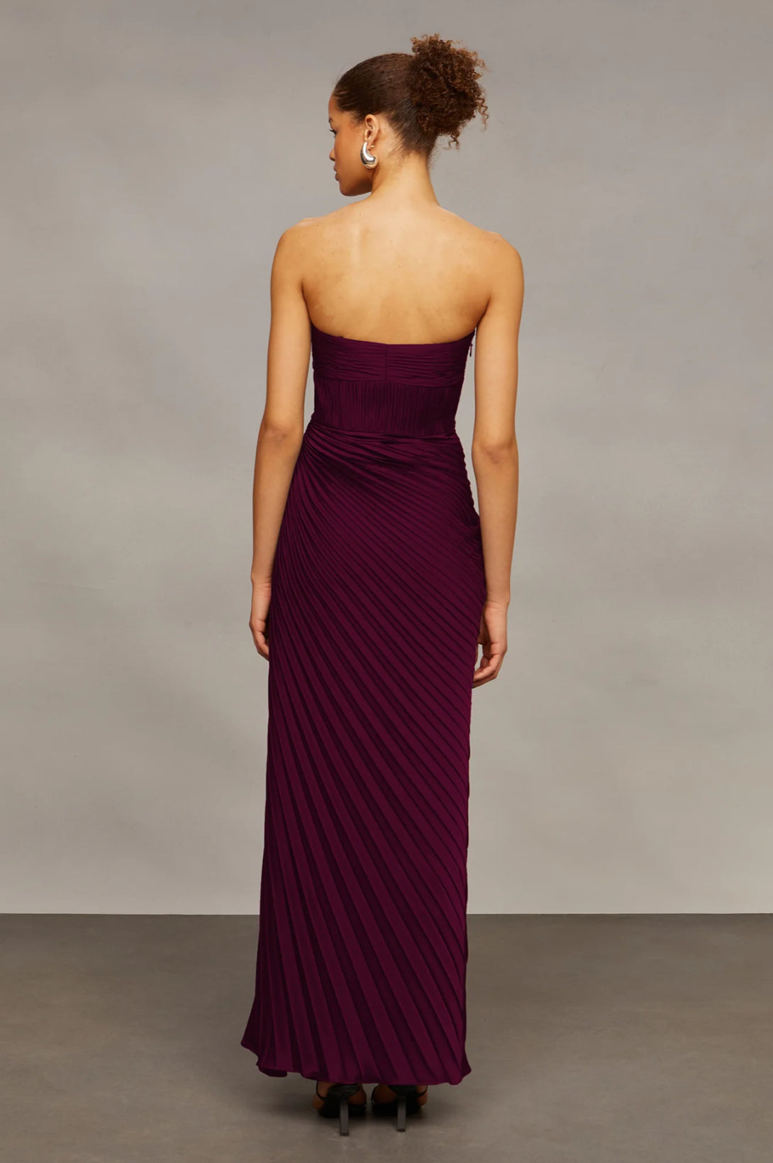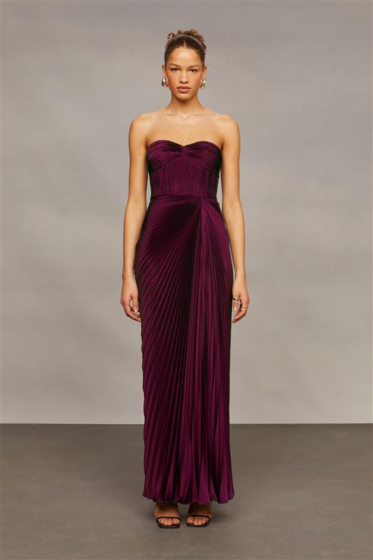 This pleated strapless gown is sculpted with a sweetheart neckline and asymmetric draping that flatters from every angle. A timeless pick for galas, weddings, or a red carpet moment.