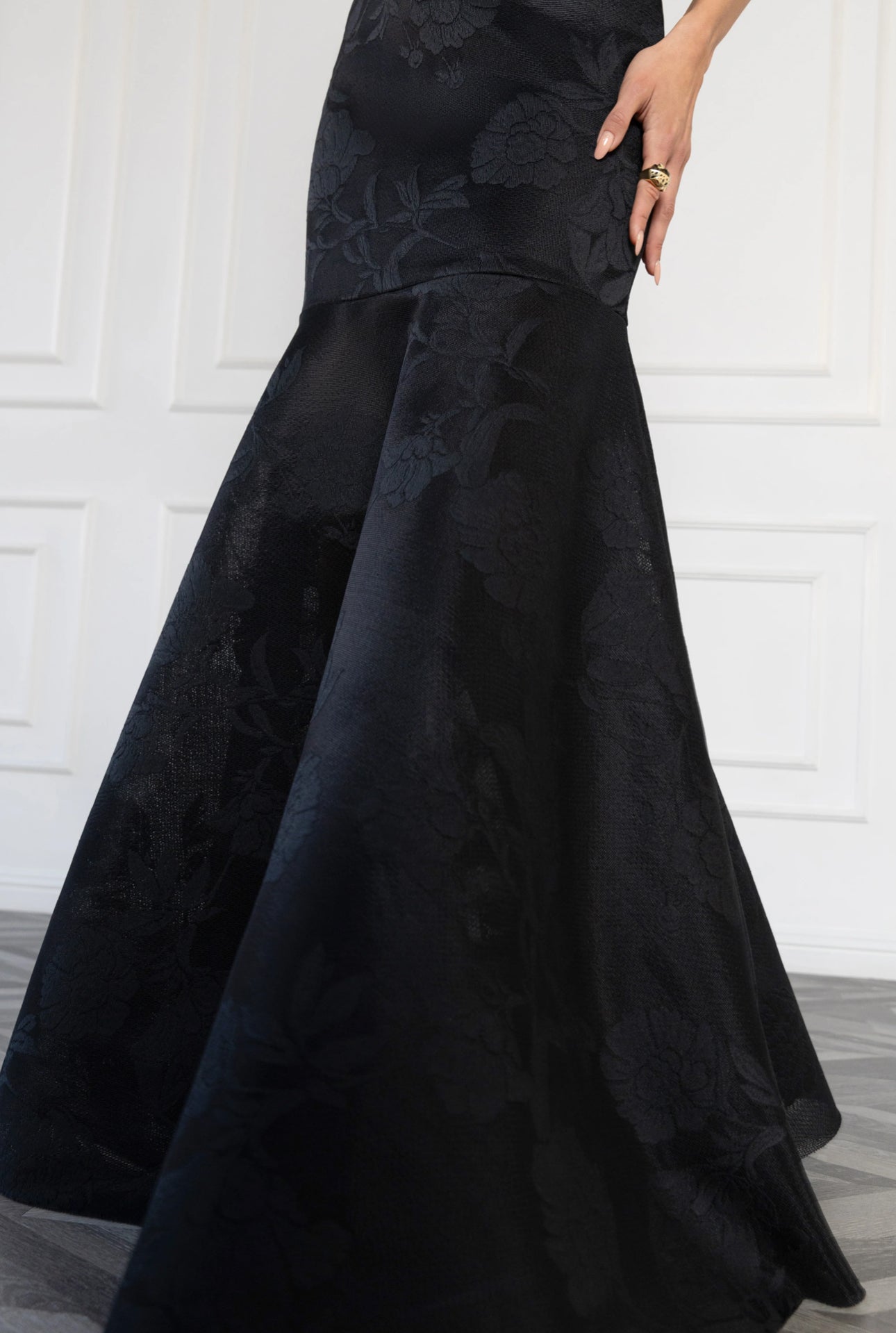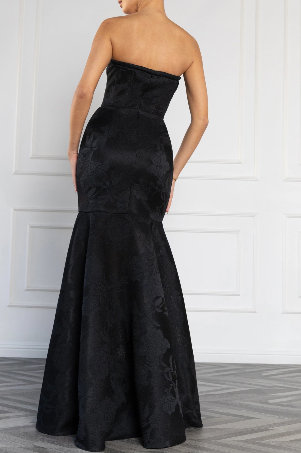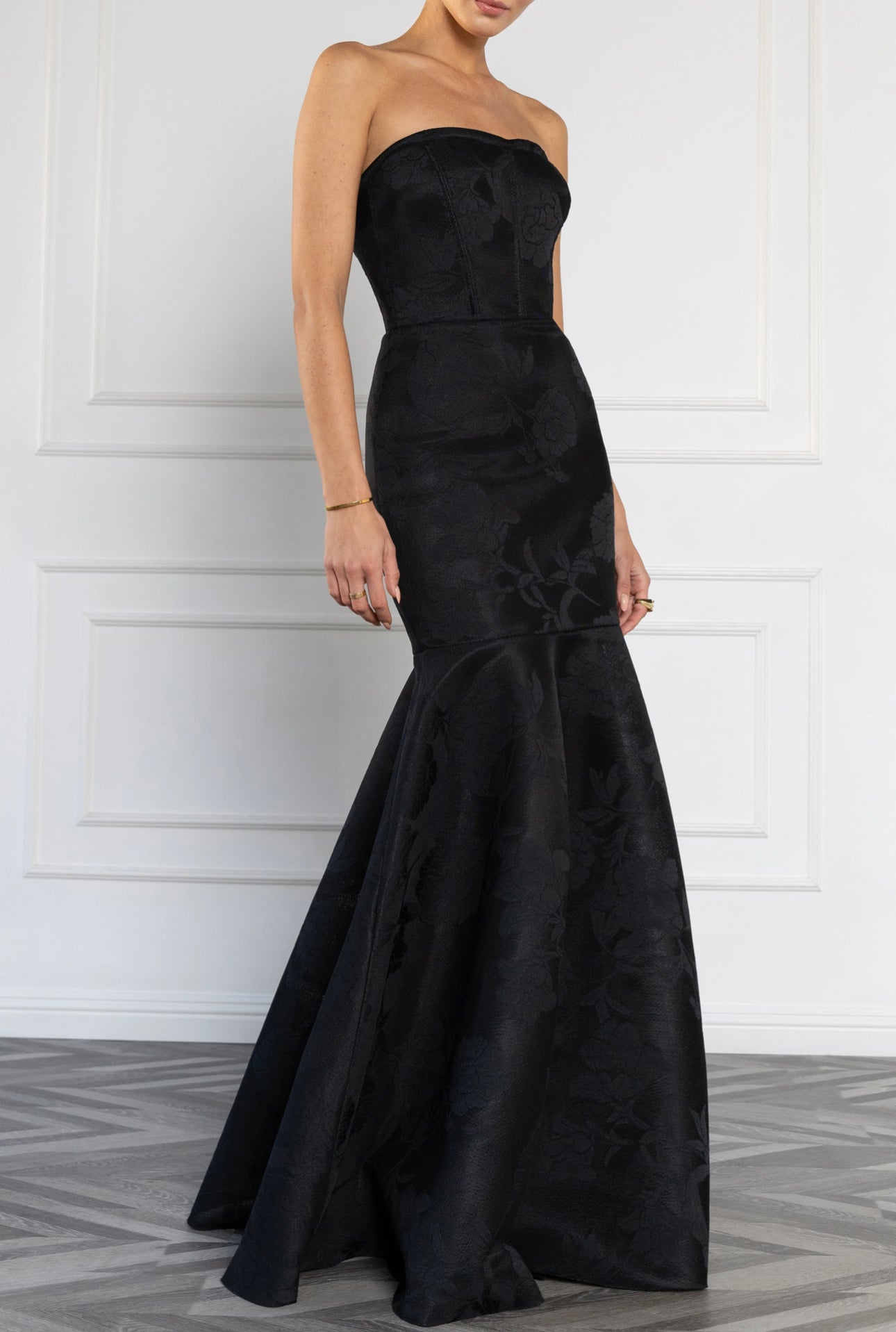 The Kristy Gown is a modern take on classic eveningwear. Crafted in a rich jacquard fabric, the strapless silhouette features subtle piping along the neckline and a boned bodice that contours the waist. The fitted shape flares into a dramatic floor-length skirt with a circle sweep, creating graceful volume and movement with every step. It’s an effortlessly striking gown, perfect for any black-tie affair.