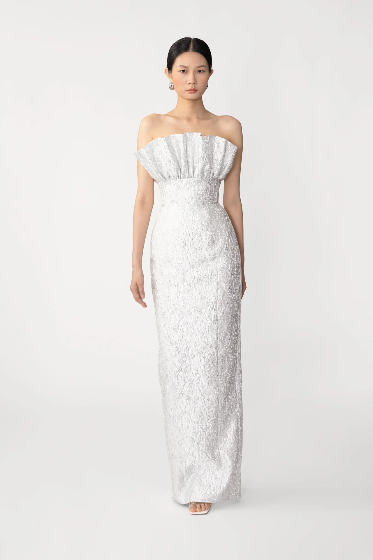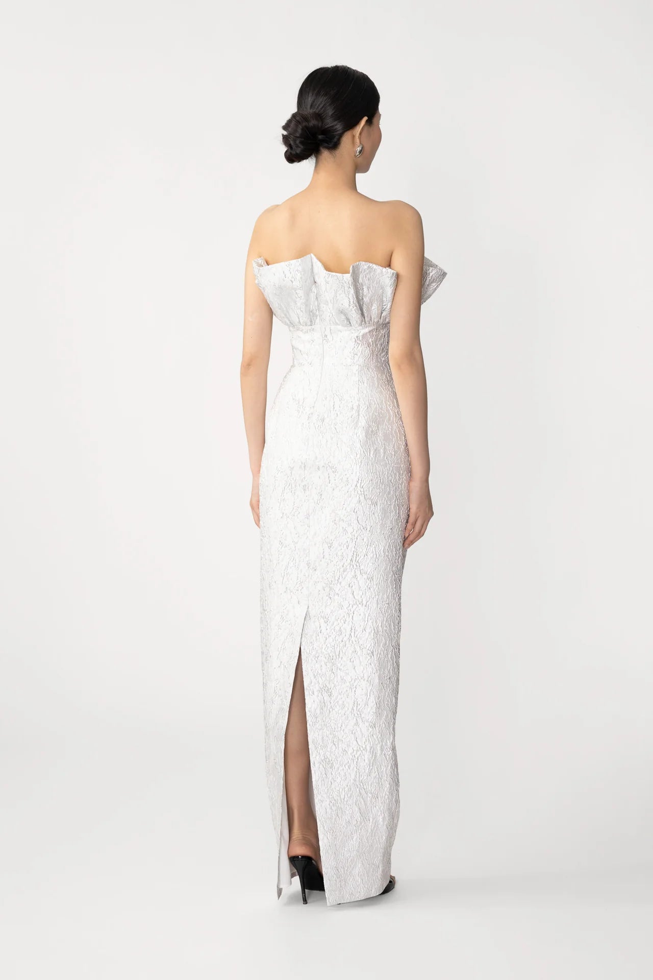 Strapless fitted jacquard gown with a waist panel and internal boning featuring a stiff ruffle detail at the bust.