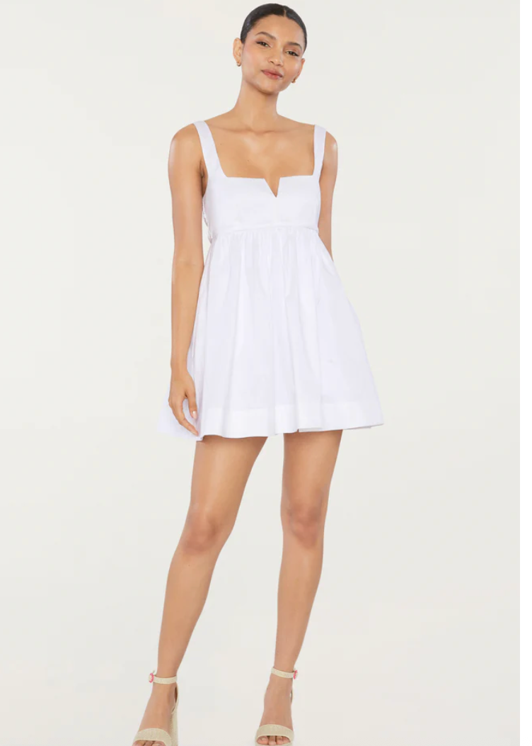 Unleash your inner fashionista with our Randa Dress! Featuring a flattering sleeveless fit and flare style, this mini dress is designed with a notched neckline in a classic white color. Made with our favorite stretch fabric, you'll feel comfortable and confident all day long. Upgrade your wardrobe with this must-have piece.