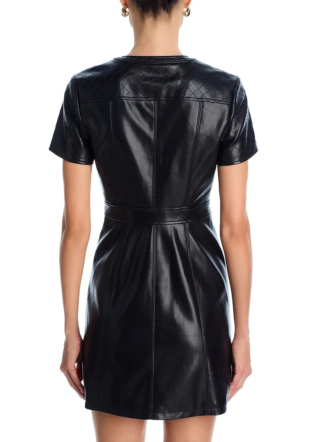 This black faux-leather mini dress delivers bold sophistication with its quilted shoulders, gold button front, and tailored silhouette. Short sleeves and front pockets add structure, making it the perfect statement piece for nights out or elevated daytime looks.