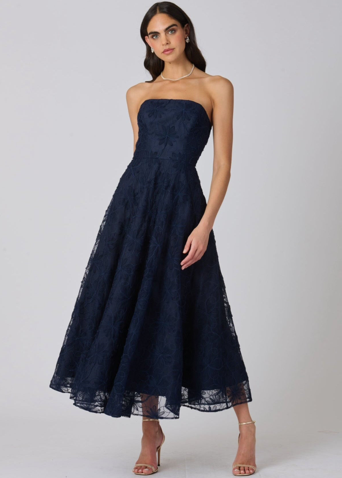 Effortless elegance in midnight blue. A timeless strapless silhouette with delicate texture, perfect for any evening moment.