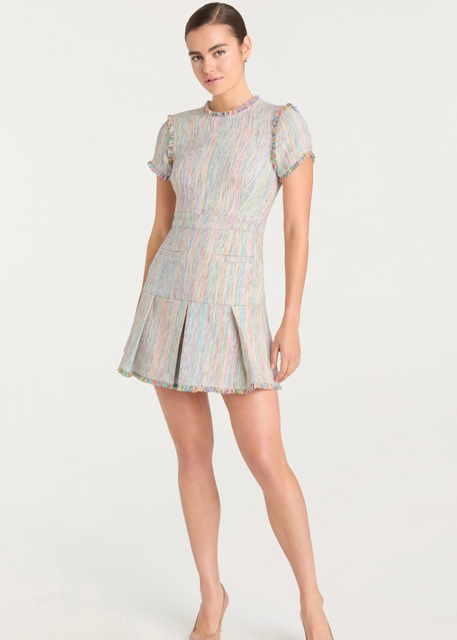 The Natalie dress combines a tweed fabrication with its prism-inspired colors, making for a truly unique look. Complete with frayed stitching for a refreshingly playful style.