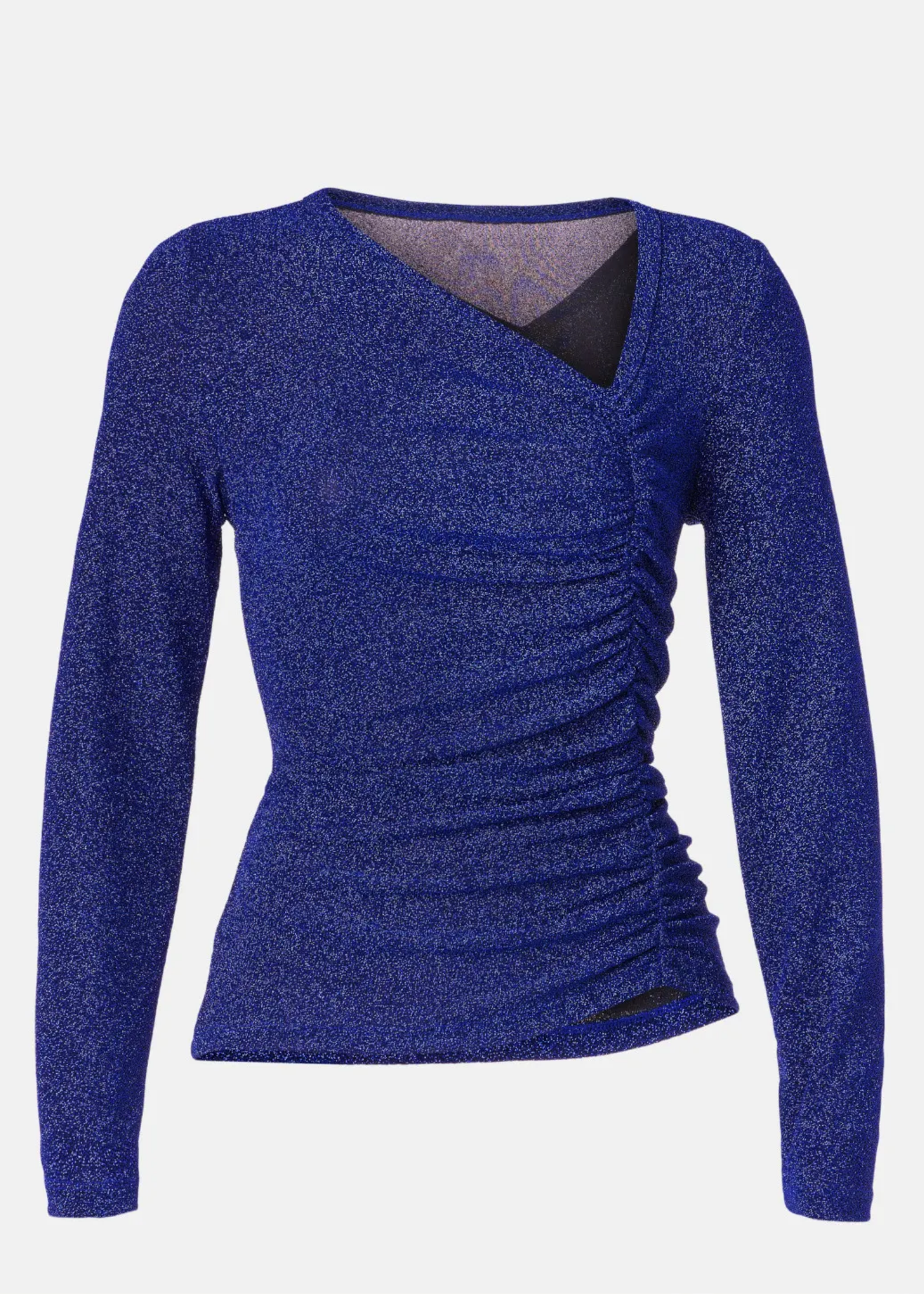 The Krissy Top features an asymmetric V-neck design and front shirring detail, creating a fitted silhouette. Made with a metallic knit material, this top provides a subtle shimmer, perfect for adding some glam to your wardrobe.