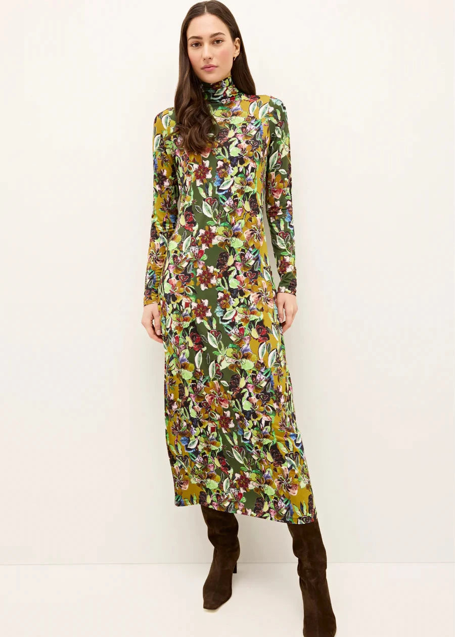 One of our Founder’s favorite seasonal silhouettes, this figure-skimming turtleneck dress features a soft jersey knit that underscores Paxton’s elegant lines. The slip-on style is pictured here in bloom, a painterly floral that combines the best of the season: flora, fauna, and all the moody elegance of shifting temperatures. Layer the dress with our Lark jacket in Army for a complete and practical autumn look.