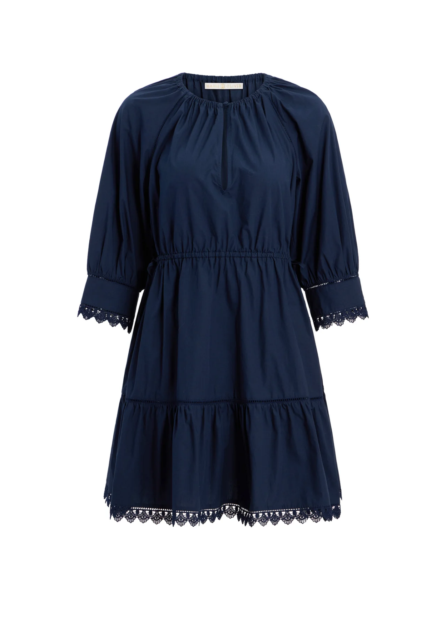 This dress showcases a relaxed yet refined silhouette in a deep navy tone, ideal for effortless, everyday elegance. Crafted with voluminous 3/4 length sleeves and a tiered mini skirt, it features delicate lace trim along the cuffs and hemline for a subtle feminine touch. A gathered neckline with a small keyhole opening adds a hint of charm, while the cinched waist provides gentle shaping without compromising comfort. Styled here with tall suede boots, this look strikes a perfect balance between casual sophistication and laid-back style.
