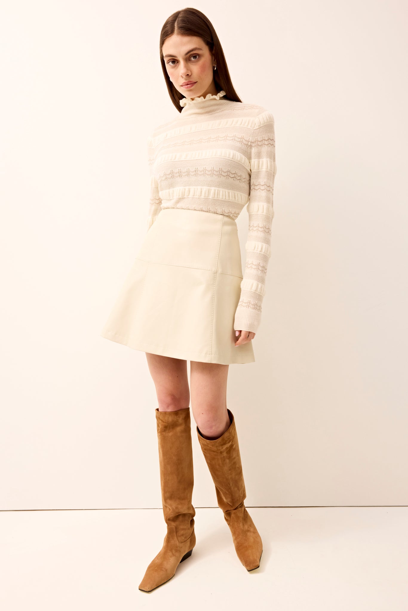 The building block of many a stellar autumnal ensemble, the Crawford skirt will surely become a constant in your wardrobe. Fitted at the waist and hips, a slightly flared, vegan leather silhouette makes it the perfect companion for sleek tops, chunkier knits, and knee-high boots as the weather turns colder.