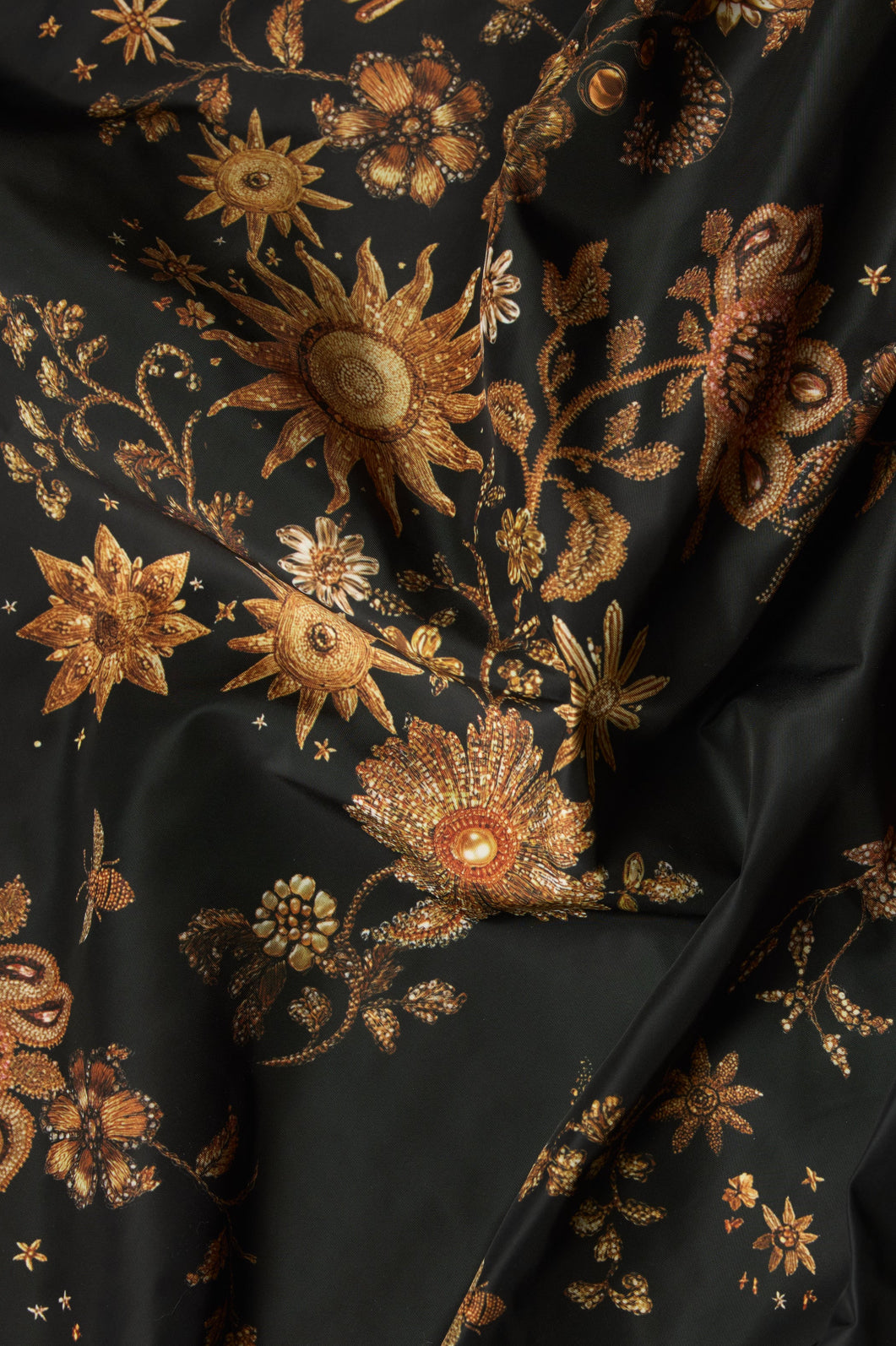 Faith is a tailored midi skirt defined by a fixed waistband and feminine box pleats that add movement and a slight flare. Shown here in our new Gilded print, a photorealistic celestial floral in black and gold.