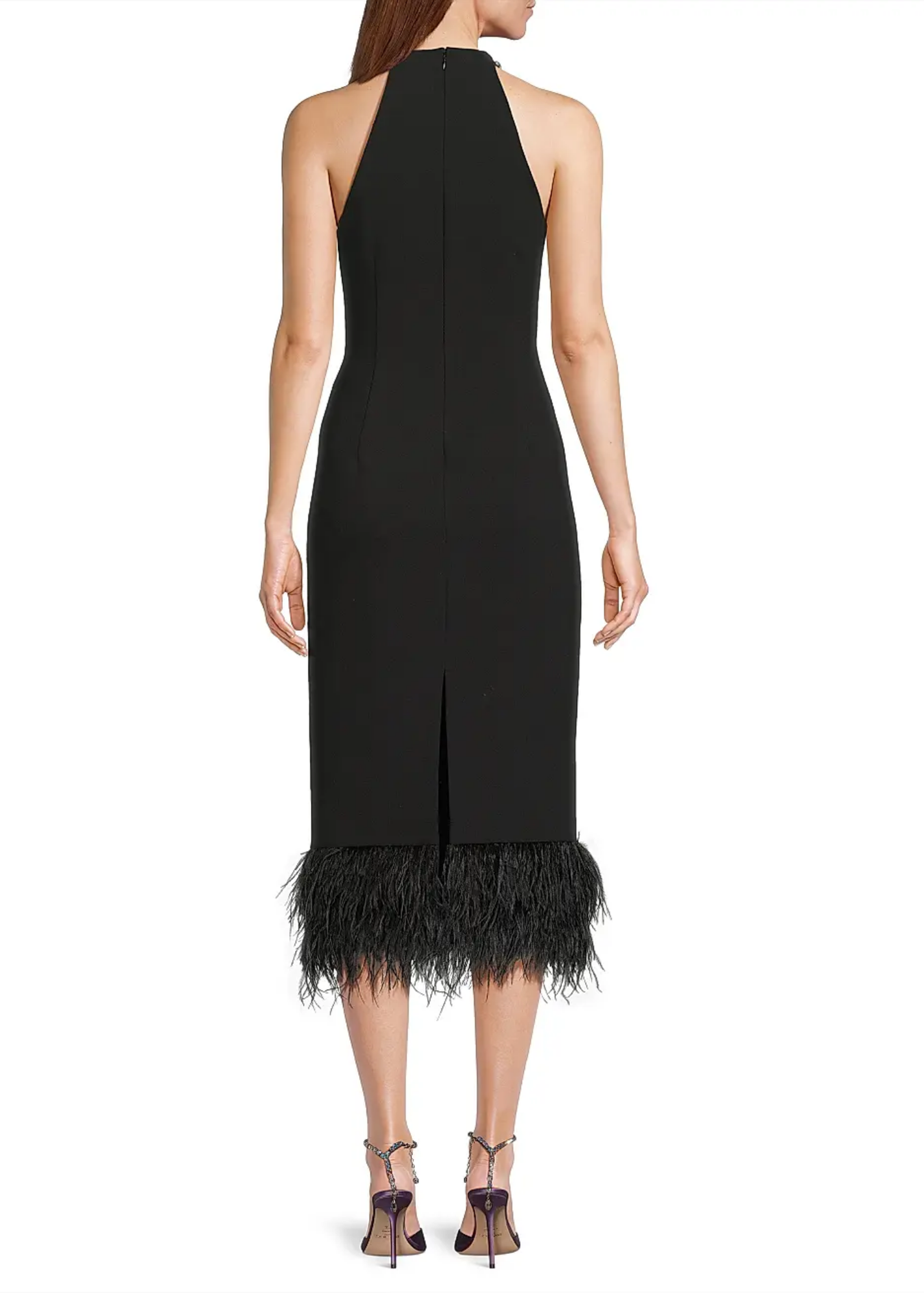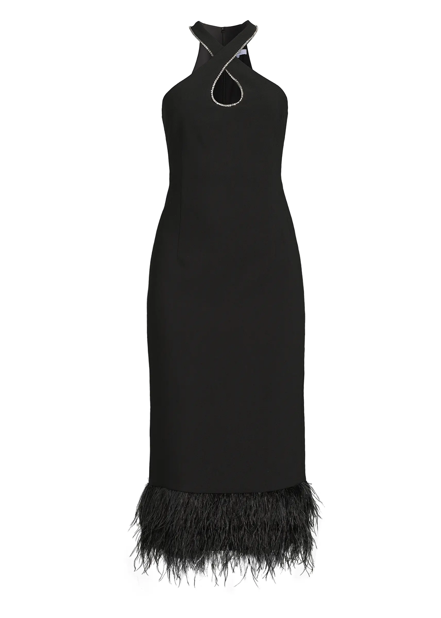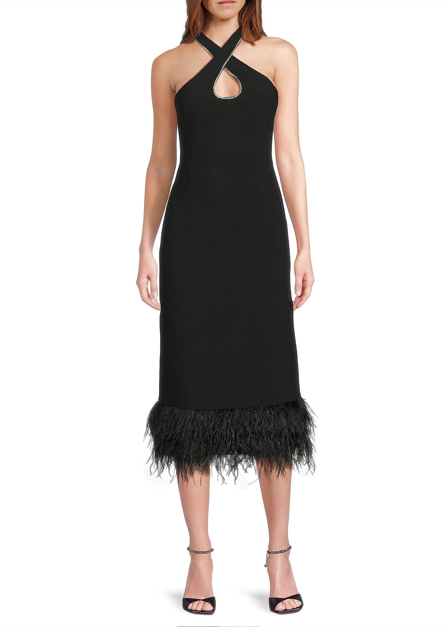 Be fun in feathers at any cocktail event! The keyhole and halter neck complement one another to create a flattering look. Pair with black heels!