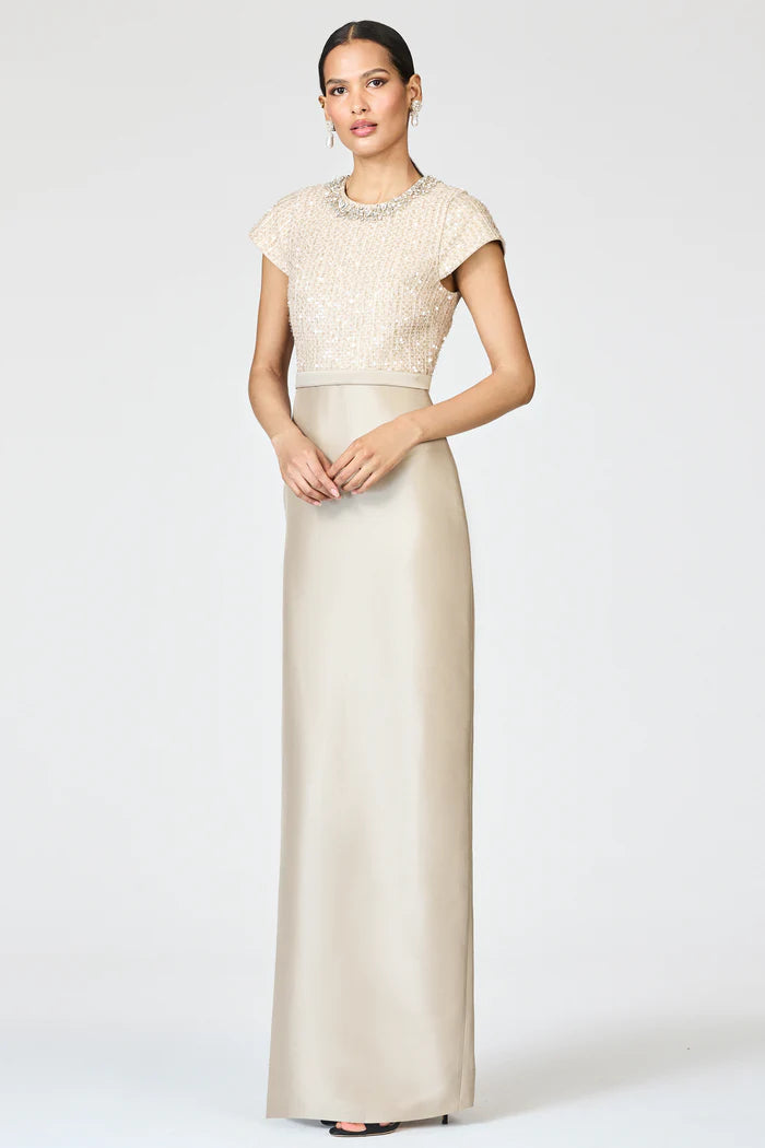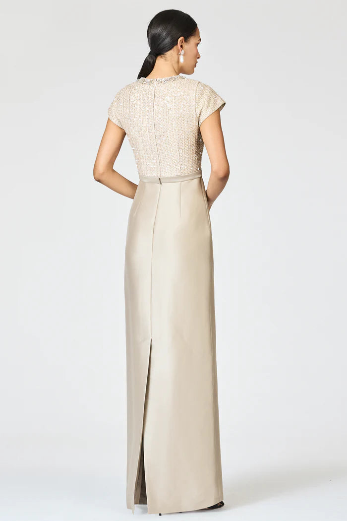 The Isla Gown in Dune/Pewter is a study in understated luxury and modern refinement. The bodice features a column silhouette paired with a cap sleeve crafted in tonal sequin tweed, catching the light with subtle, sophisticated shimmer. At the neckline, an ornate crystal-embellished collar adds an extra layer of radiance and polish. A clean Mikado skirt in Pewter drapes in a statuesque column, cinched with a coordinating waistband to define the figure. Effortlessly elegant, Isla is artfully embroidered by our 3rd generation artisans at our family-owned atelier in Mumbai.